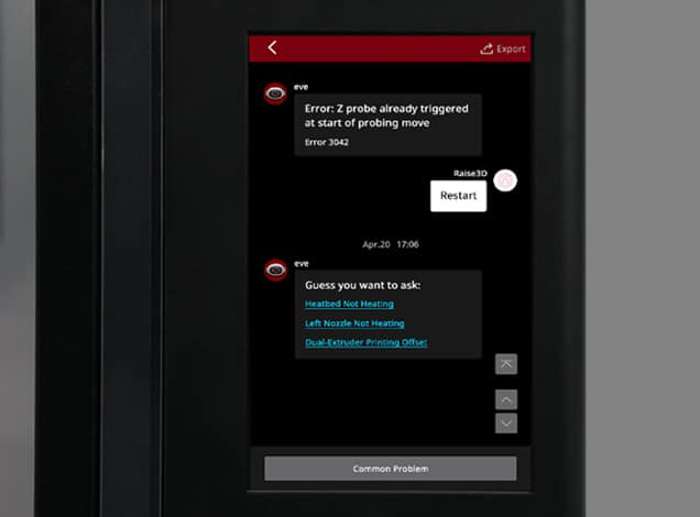 The Pro3 Series has a built-in EVE assistant system, preloaded with common printing problems and corresponding solutions. The EVE assistant can guide users to accurately locate and resolve issues that could affect the final print job.